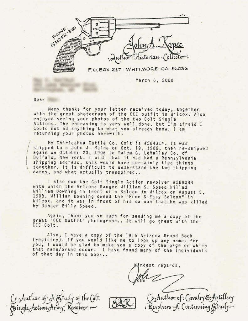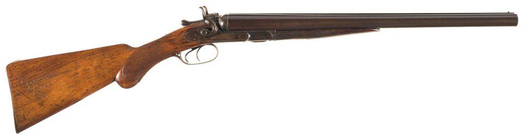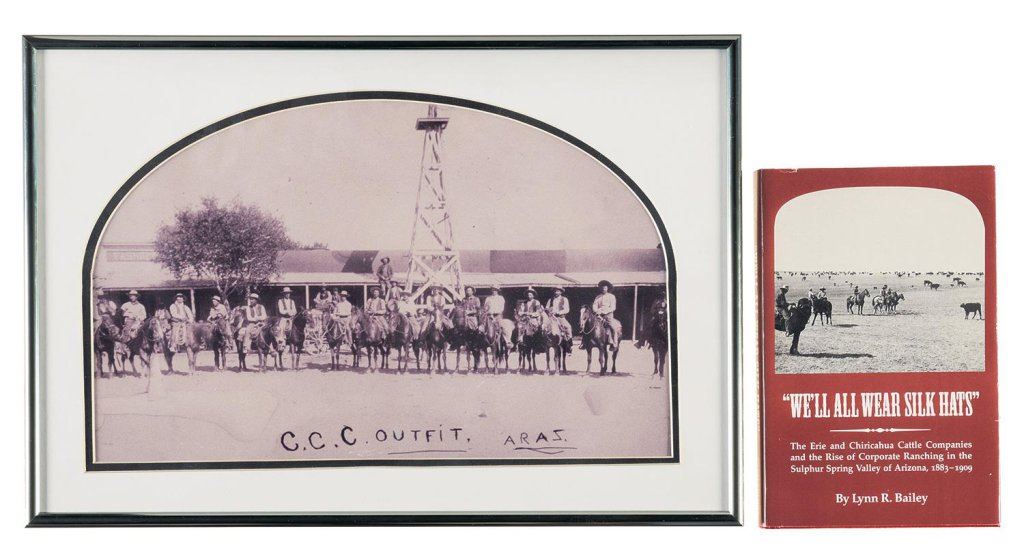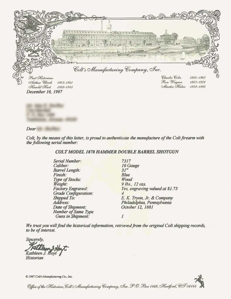 The included factory letter states that the shotgun was shipped from Colt on October 12, 1881, to E.K. Tyron & Co. of Philadelphia, Pennsylvania, and confirms the serial number, original barrel length, finish, and gauge. Features 2 3/4" chambers, 13 1/4" LOP, and "CHIRICAHUA CATTLE Co" stamped on the right side of the buttstock. A letter from noted Colt historian and author John Kopec, bill of sale and letter from historian and collector Stephen Elliott, and a copy of the book "We'll All Wear Silk Hats: The Erie and Chiricahua Cattle Companies and the Rise of Corporate Ranching in the Sulphur Spring Valley of Arizona, 1883-1909" are included.