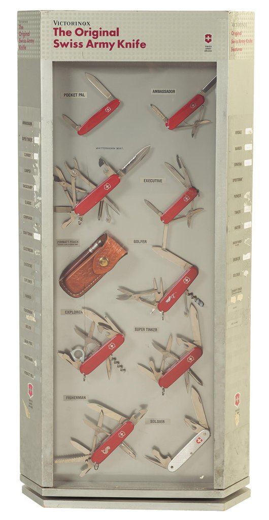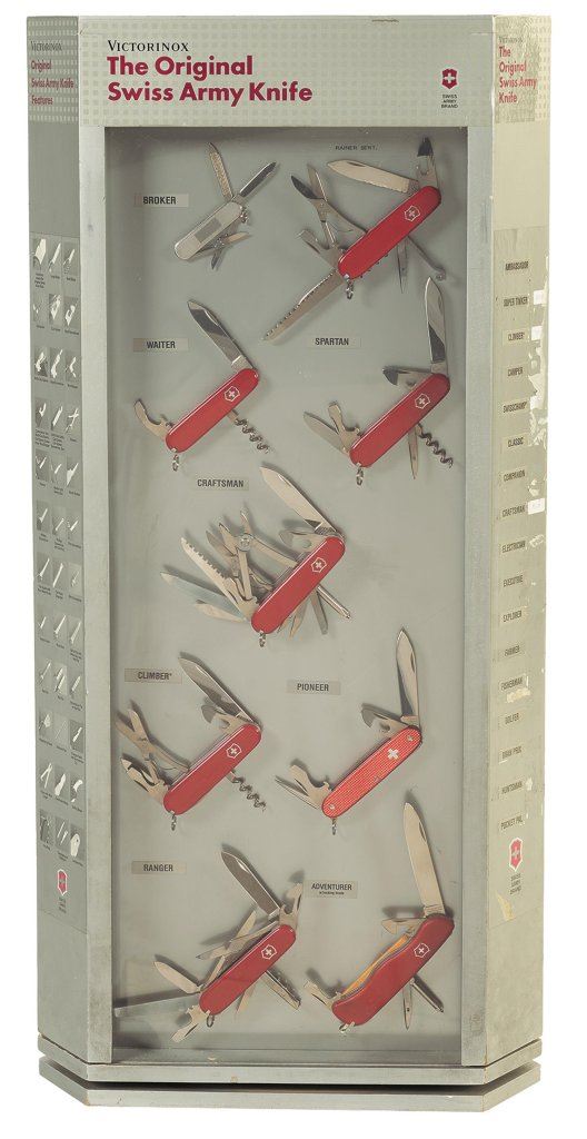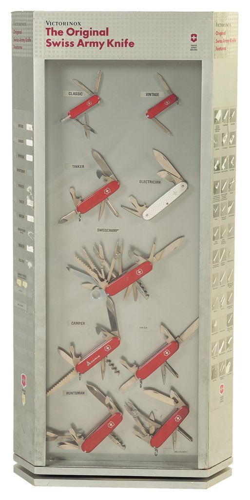 1) Revolving knife display, 31" tall and 13" wide, featuring 27 knives (including the Swisschamp, Craftsman, Adventurer, and others) and one leather belt pouch. Includes a pictorial chart of available features and a (partial) price list. 2) Motorized advertisement, roughly 32" tall, with an oversized Swiss Army knife featuring five moving blades and tools along with a reamer that just sits there and minds its own business. Shows some light handling marks and operating wear and is mechanically in good order.