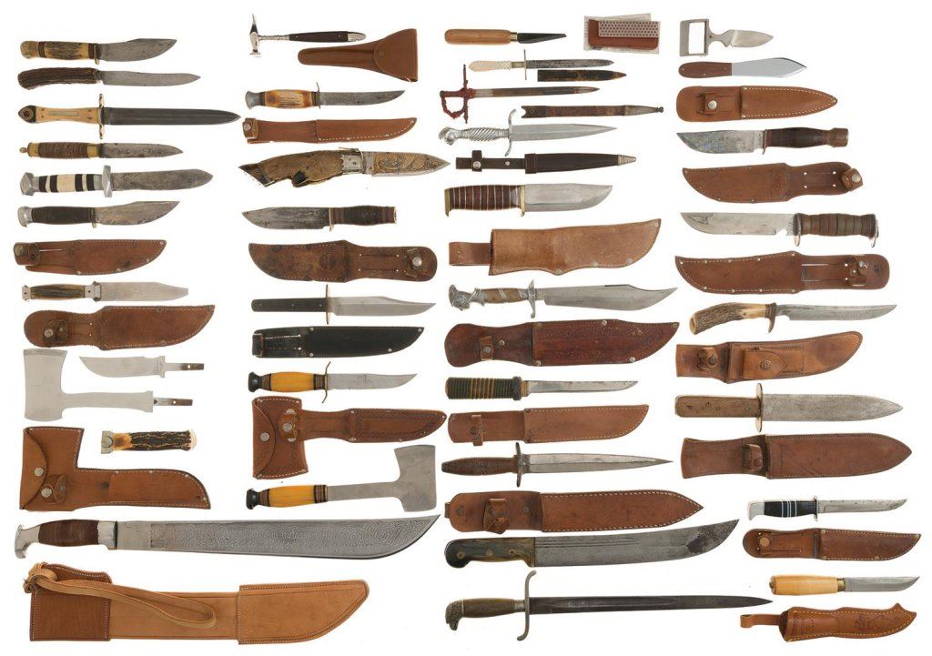 1) Mexican machete with etched blade and leather sheath. 2) Belt buckle knife. 3-4) Small KABAR camp axe and stag handle knife with shared sheath. 5) Horn handled machete. 6) Hoof handled folding knife with etched blade. 7) American eagle pommel dagger with bayonet style blade. 8) Small hammer with sheath. 9-10) Kinfolks hunting knife and camp axe with shared sheath. 11) Medieval sword style letter opener/knife with scabbard. 12) Whetstone with case. 13) Small Taiwanese carving knife. 14-18) Knives and daggers without sheaths. 19-36) Knives and daggers with sheaths. Condition: Fair to very good. Most items are fine or better.