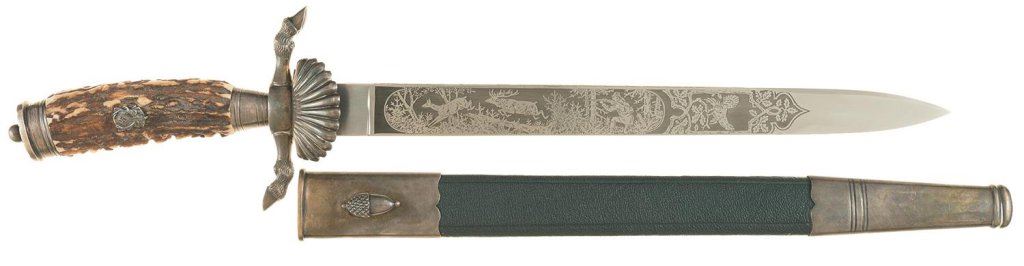 18 1/2" OAL, with a 13" etched blade, silver finished fittings and sheath, and a stag grip. With a loose Nazi-style Hunting Association grip badge. Dagger is very good, though possibly post-war construction.