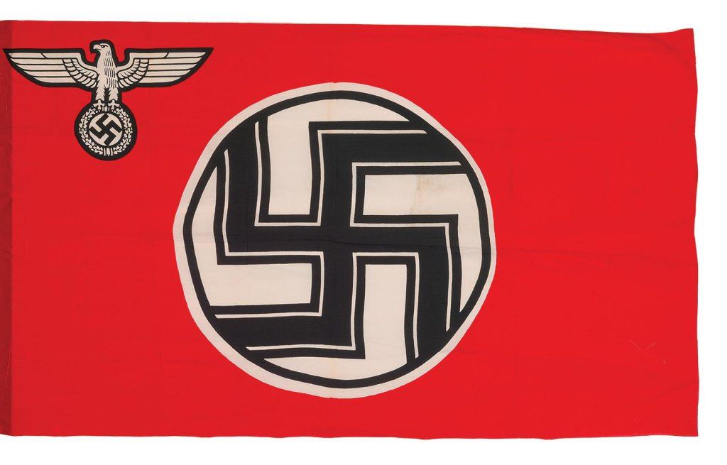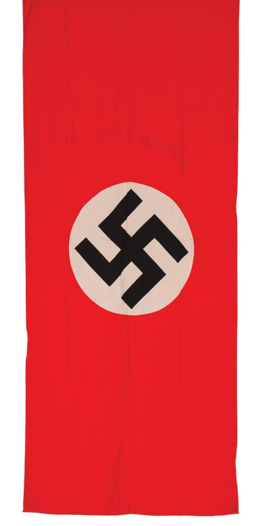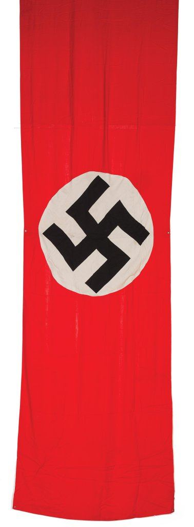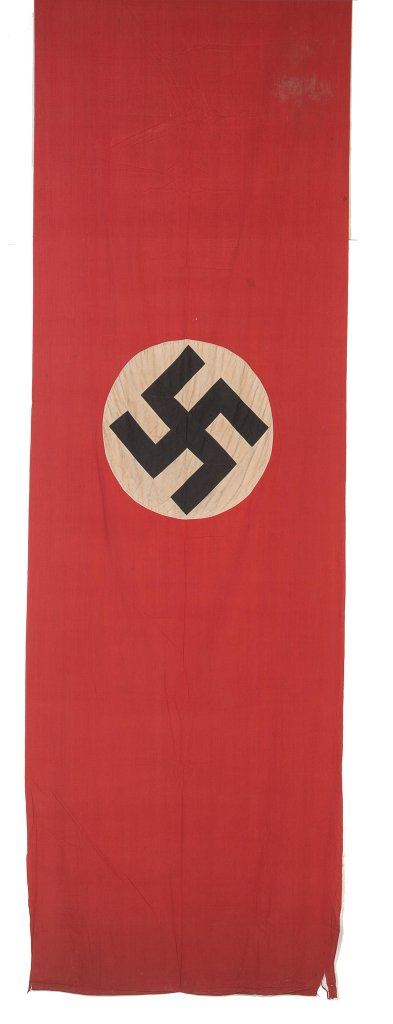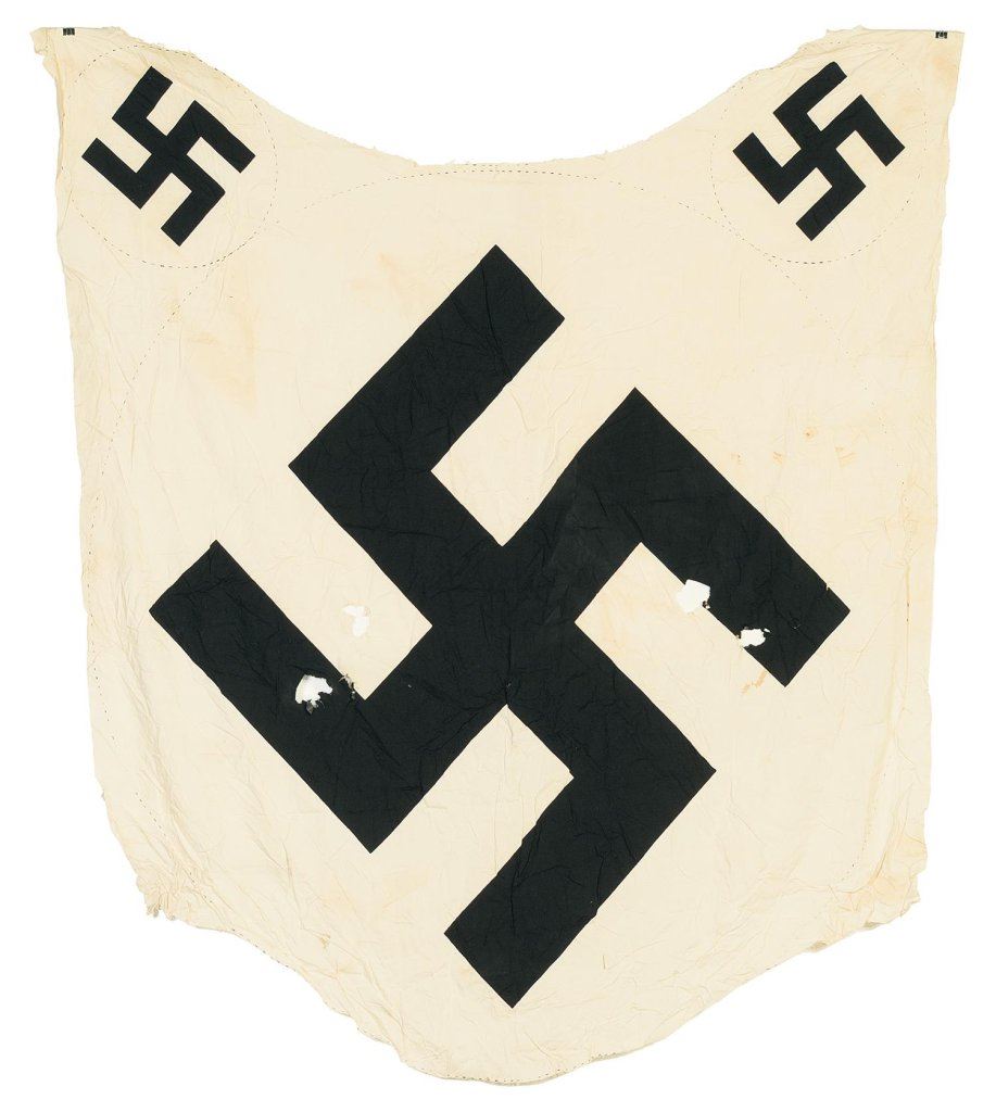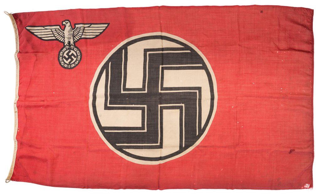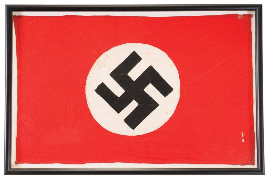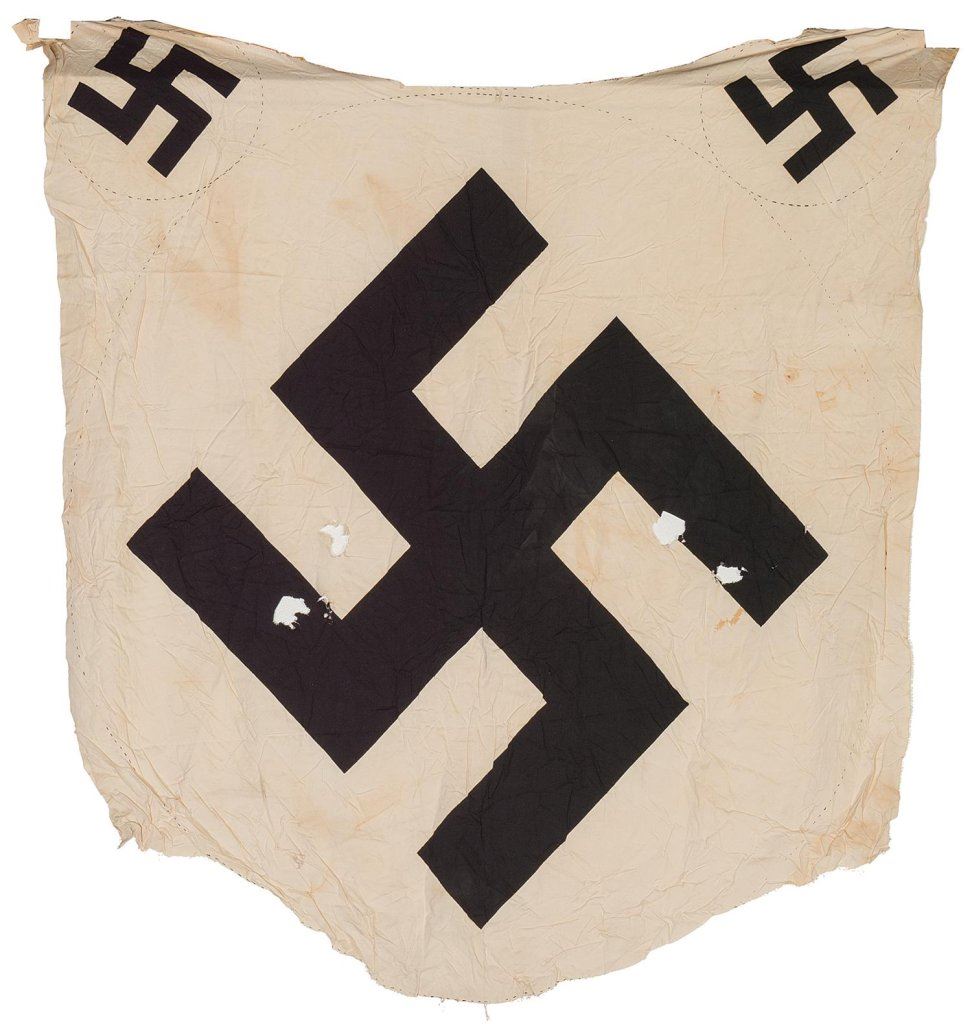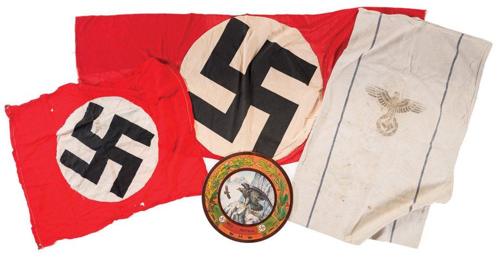 Lot includes an assortment of Nazi propaganda including 1 framed 16 3/4" X 25 1/4" Nazi flag. Very good with some light discoloration. 1 wooden sign marked "WIR OPFERN/WHW" with an eagle and swastikas. Very good. 10 assorted Nazi flags/banners including a large naval jack. Flags vary in size from very large to small and range from poor to very good condition. 1 German army provisions sack marked "H.Vpfl./1941" on the front with the "eagle/swastika" insignia on the back. Good with light discoloration throughout. Assortment of smaller cloth items including 10 Nazi themed armbands, patches, pennants, Kriegsmarine hat ribbon, and three non-Nazi armbands. Ranging from fair to very good.
