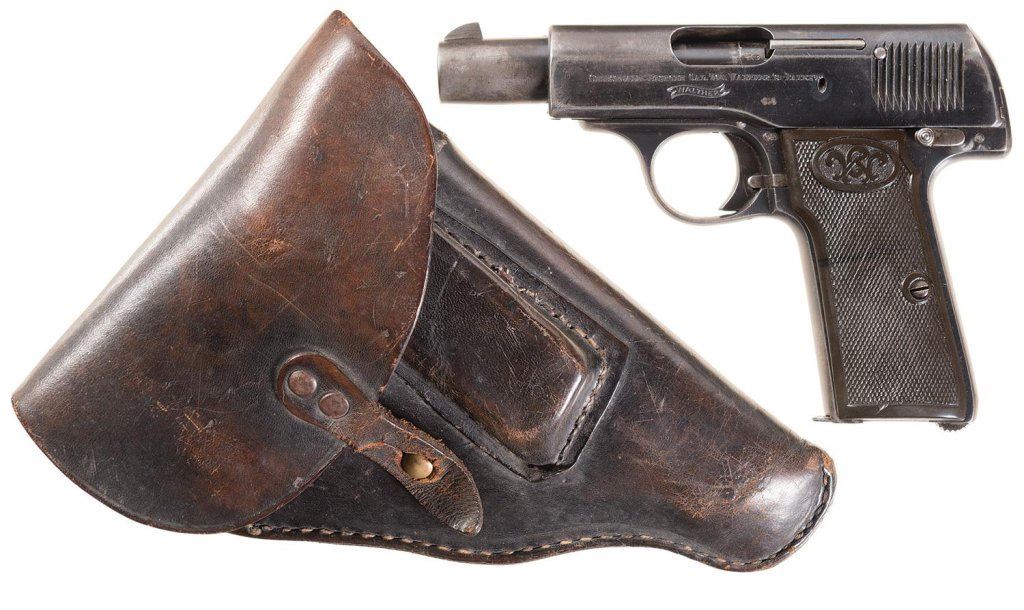 Early transitional model with the right side of the slide blank and "SELFSTLADE-PISTOLE CAL 7.65. WALTHER'S-PATENT" over the Walther banner logo on the left. Includes an unmarked leather holster.