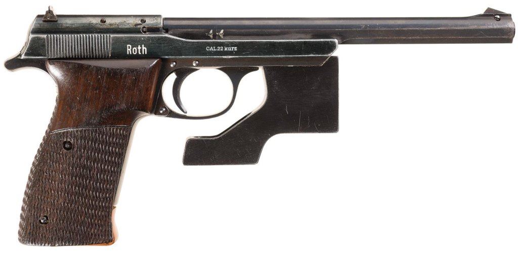 The right side of the alloy slide is marked "ROTH". It is fitted with a single counterweight and displays Nazi "eagle/N" proofs on the barrel and slide.