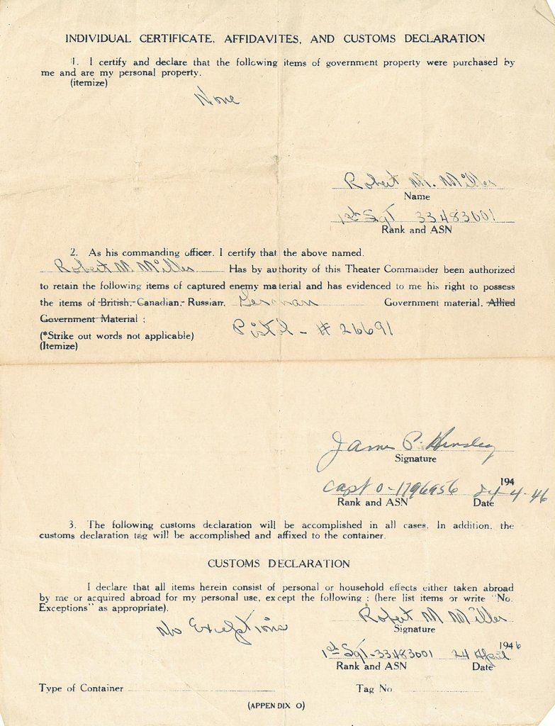 The pistol includes an April 24, 1946, dated capture/customs declaration document listing the pistol by serial number as captured by a 1st Sergeant Robert M. Miller. A brown leather holster with a Robert M. Miller property tag and extra magazine is also included.