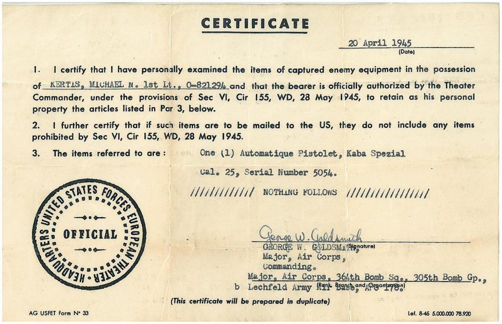The pistol includes a U.S. capture certificate dated April 20, 1945, listing the pistol by serial number as captured by 1st Lieutenant Michael N. Kertis.