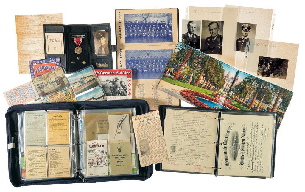 The lot consists of a very interesting array of American postcards from WWII, war bond advertisements, ration books, discharge papers, letters of commendation, signed photographs of German soldiers, Japanese issued Filipino currency, and Allied issued Japanese currency. Fine to very fine.