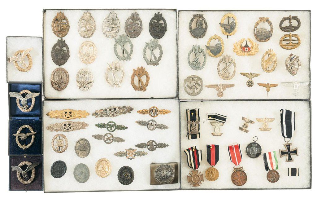 Lot includes a number of Wehrmacht (Heer, Luftwaffe, Kriegsmarine) qualification badges and clasps, variants of the Wound Badge, a belt buckle, a WWI Iron Cross with four "spange" clasps, an Italo-German Africa Campaign Medal, Anschluss, Spanish Cross Medal, and others. Good overall with some post-WWII items.