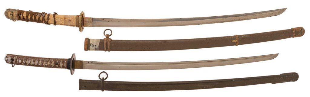 1) Military-style sword, 37" OAL, 26" blade, 1 mekugi-ana, 2 symbol signature on right, 7 on left with a small (possibly non-traditional) stamp near the tsuba. Blade fair, fittings rough. 2) NCO sword, 36" OAL, 26" single fuller blade, painted alloy hilt and saya. Fair, with mixed numbers.