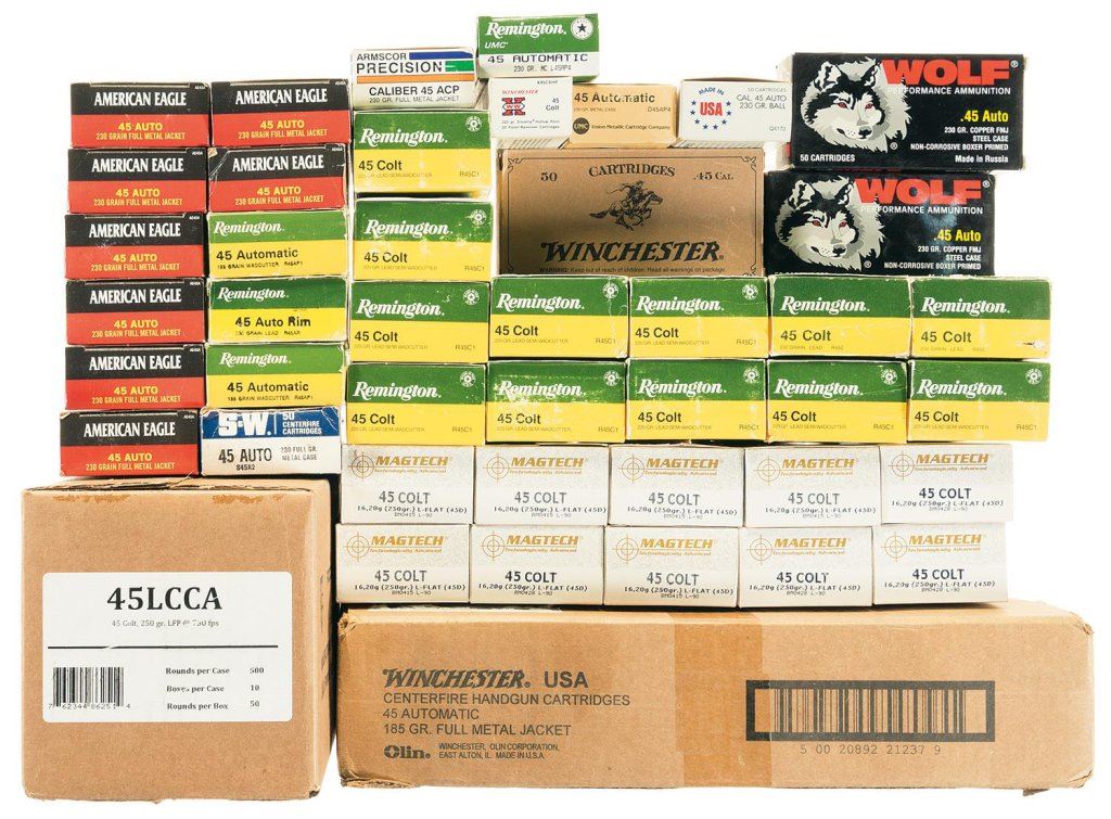 The lot includes: 1 sealed case (10 boxes of 50 rounds each) Win 45 ACP; 1 case (10 boxes of 50 rounds each) Fiocchi 45 Long Colt Cowboy Action loads; 12 boxes (50 rounds each) Remington .45 Long Colt semi-wadcutter; 10 boxes (50 rounds each) Magtech .45 Long Colt; 1 box (50 rounds) Winchester Cowboy Action Load .45 Long Colt; 1 box (20 rounds) Winchester .45 Long Colt; 17 boxes (50 rounds each) assorted .45 ACP; 1 box (50 rounds) Remington .45 Auto Rim. Ranging from new to good with some storage and handling wear on the older boxes.