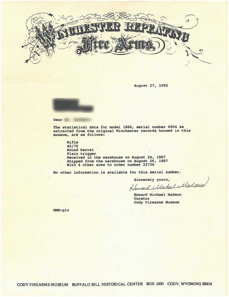 Manufactured in 1887. With Winchester factory letter that confirms the rifles configuration and that it was shipped from the warehouse on August 26, 1887.