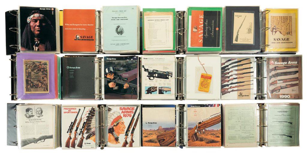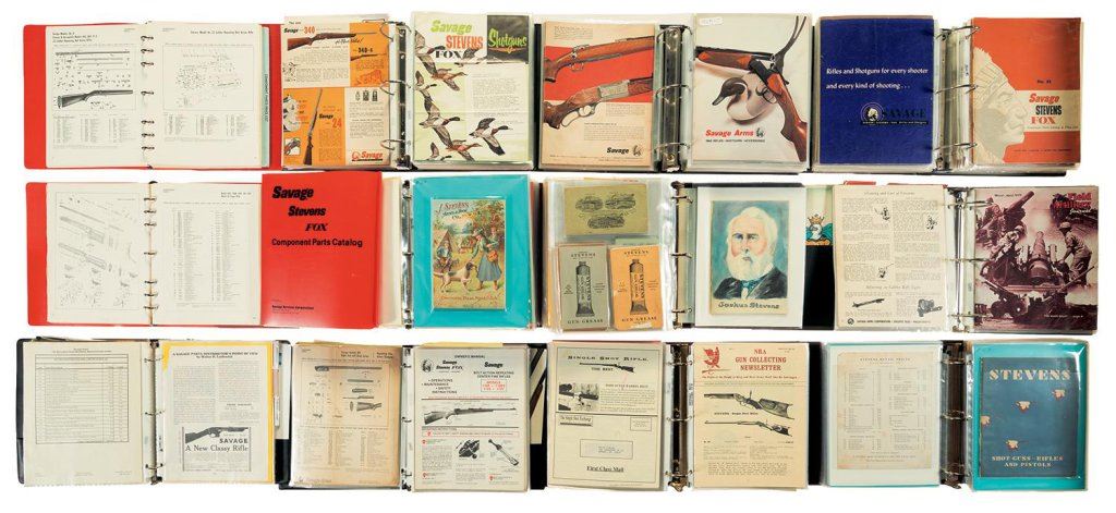 The lot consists of a number of large binders containing collected product catalogs for both the J. Stevens Arms Co. and Savage. The Stevens catalogs run from roughly the late 1800s to the 1960s, and the Savage materials span from the late 1800s to nearly current. The collection also includes a large amount of Savage retail dealer information including sales tips and jobber price lists. The collection includes over twenty volumes of information and would make a very interesting addition to a Stevens or Savage collection. Very fine overall.