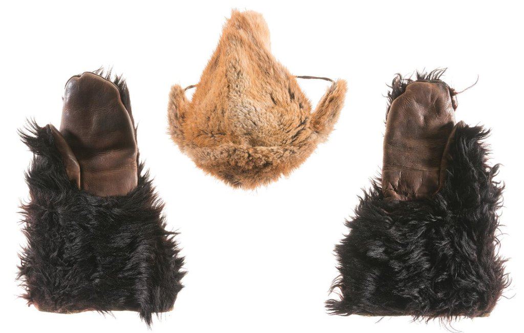 The heavy buffalo skin coat is line in brown corduroy, with silk lined sleeves. It is very good with some age cracking and slight drying of the leather components; otherwise, it has aged very well. The gloves are fingerless mittens with the same type of corduroy lining as the coat and are very good. The muskrat skin hat has fold down earflaps with a tie. Very good.