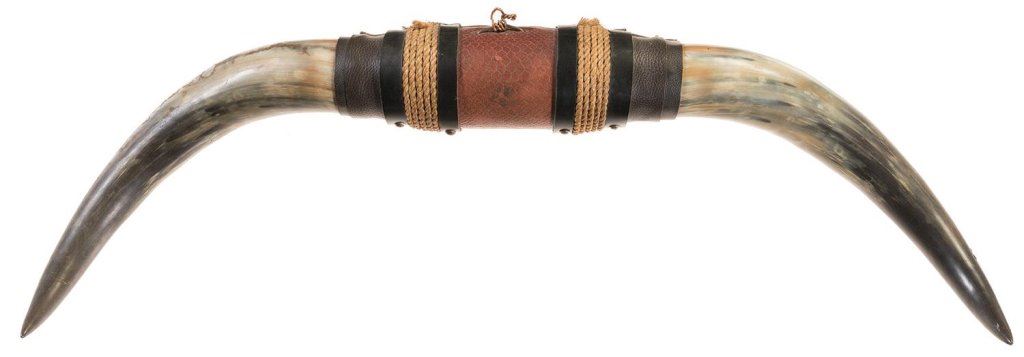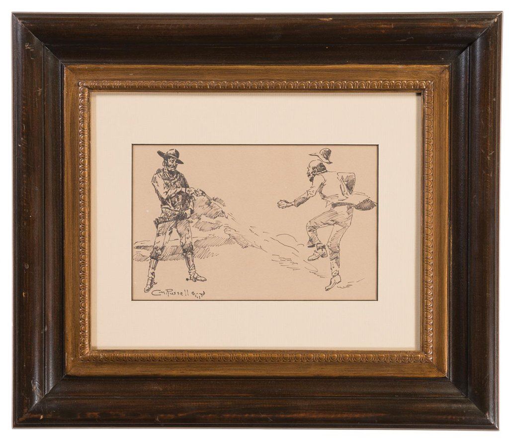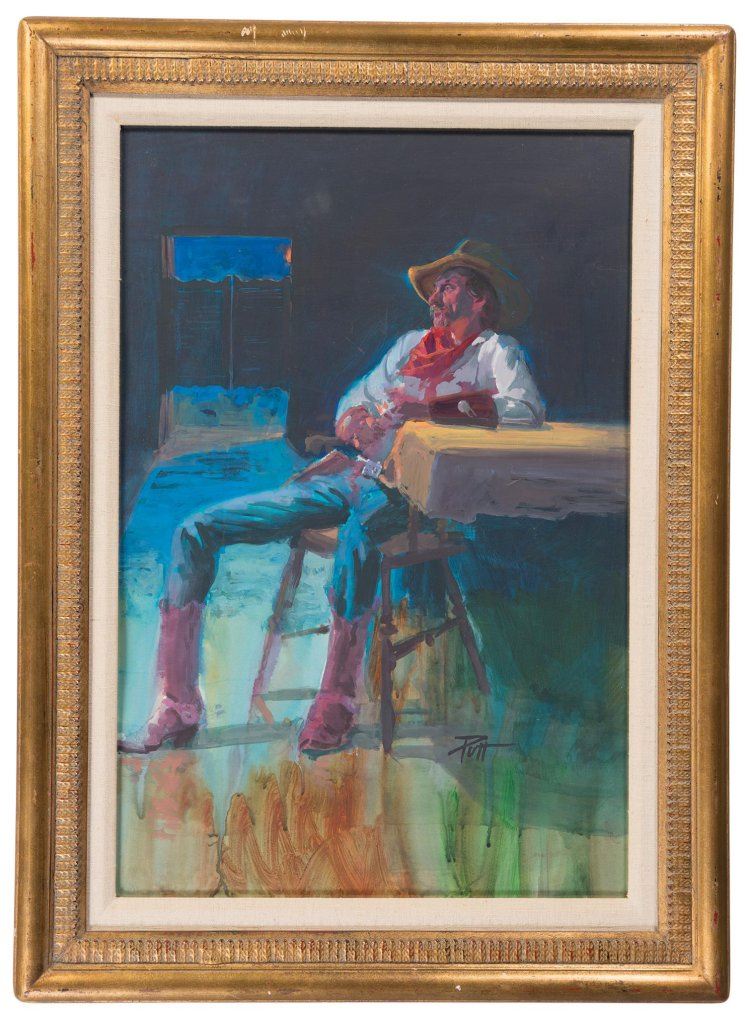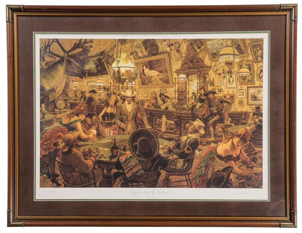 1) "Mind if I Join You Gentlemen?" by Arnold Friberg. Old West poker table print in a 42 1/4" by 32 3/8" frame. 2) Print of a cowboy in a chair at a saloon by Donald "Putt Putnam in a 27" by 37" frame. 3) C. M. Russel print of a sketch of a cowboy making another "dance" in a 20 1/2" by 17 3/8" frame. 4) Pair of mounted long horns with varying colors of leather and rope on the midsection. They measure 3' from tip to tip. Very good overall.