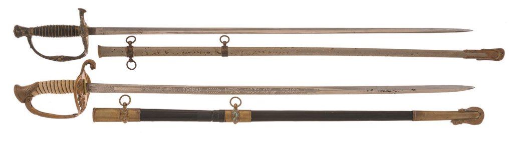 1) German-made American officers sword, 35 1/4" OAL, 29 1/2" straight blade, brass guard, leather grip, nickel scabbard. 2) Harding Uniform & Regalia U.S. Navy sword, 35 1/2" OAL, 30" etched blade, brass guard, sharkskin grip and (torn) leather scabbard. Both are good, with mild spotting and handling marks.