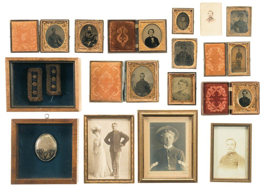 The lot includes 9 Civil War era daguerreotypes mostly depicting Union military soldiers. Most of the portraits are held in folding cases of either wood, leather, or gutta percha with decorated stamped copper matting, ranging from poor to very fine. Three framed and one loose photograph are included depicting U.S. soldiers from the Indian War and Spanish American War eras. Consignor notes that included in the images are what appear to be an unarmed Confederate and a youth drummer boy. The shoulder straps are dark blue with three stars, indicating a lieutenant general. No information is included with the straps. Fair with an overall dark color, and some loose strands of the gold metal threading at the edges. The included sword plate is silver with patriotic themed engraving and "NVY" on the front. Plate is fine with a darkened aged patina.