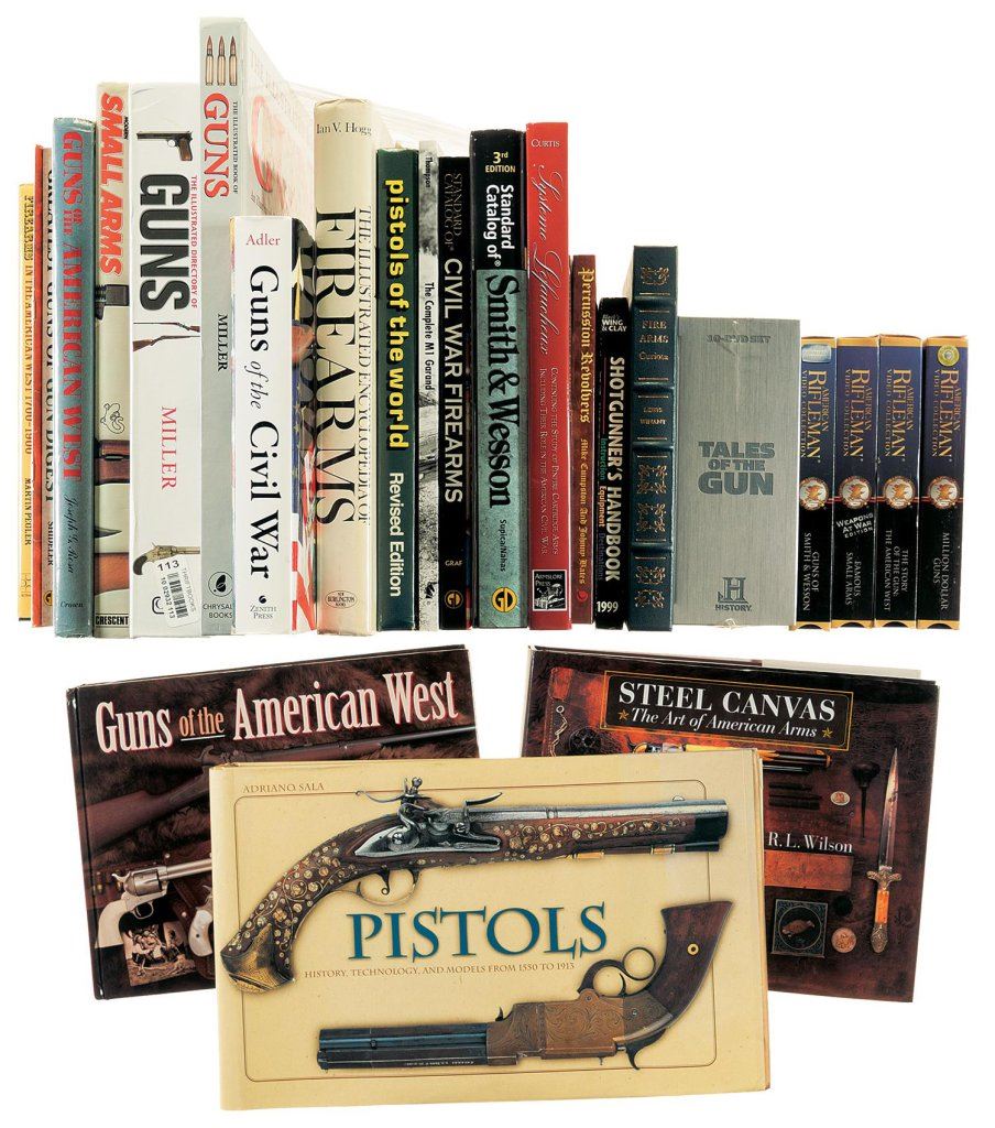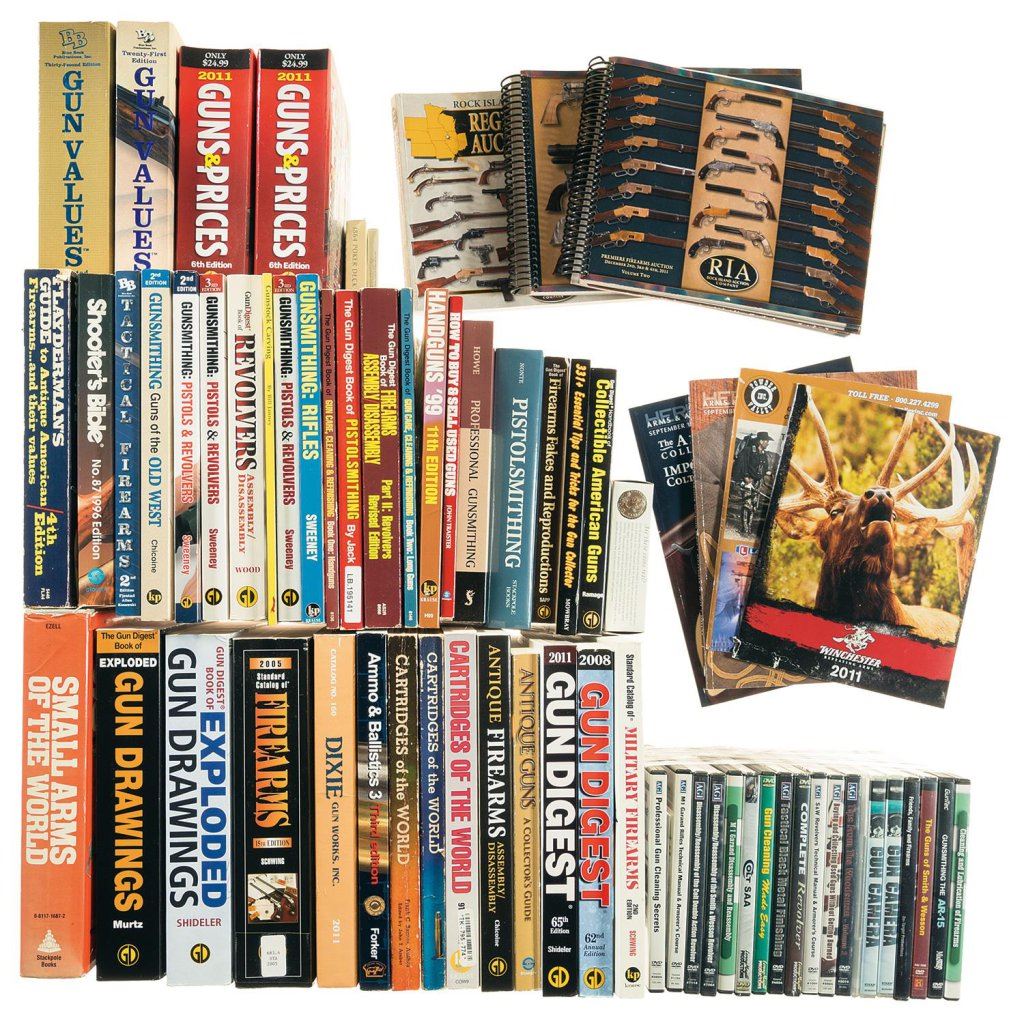 Approximately 66 firearms related book and various collector's guides. Among the items are the "Standard Catalog of Smith & Wesson," "Steel Canvas," and "The Illustrated Directory of Guns" and 23 firearm related videos, two decks of playing cards, and one coin cleaning kit. The items are mostly in very good condition. Many of the items are near new.