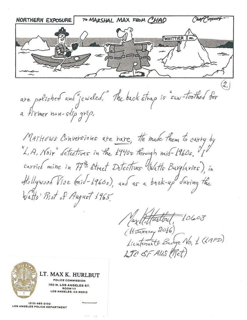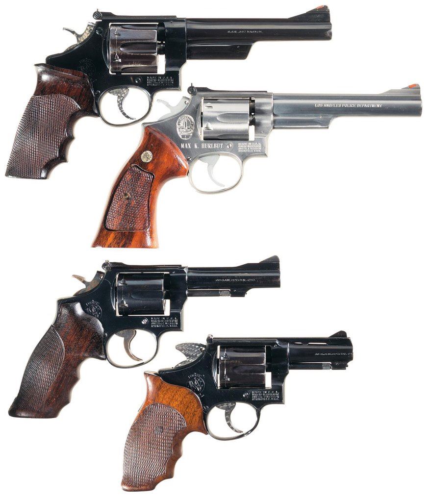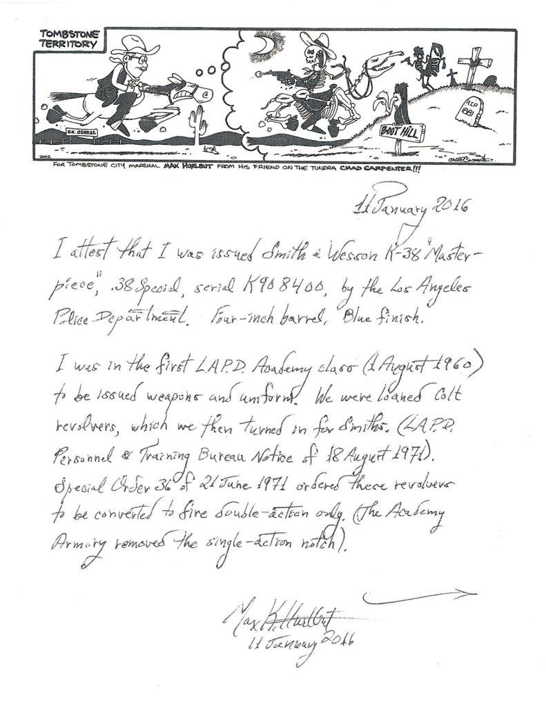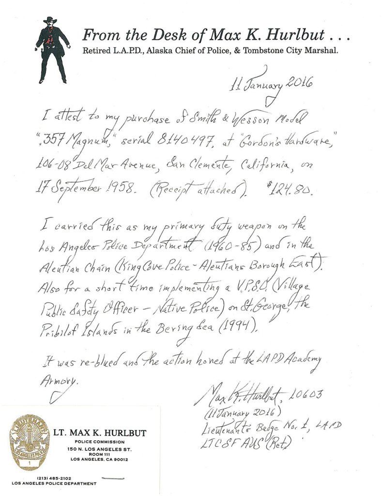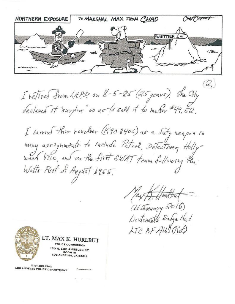 Manufactured in 1984. Marked "LOS ANGELES POLICE DEPARTMENT" on right side of barrel and "MAX K. HURLBUT" as well as Lieutenant's badge No. 1 engraved on right side of frame.