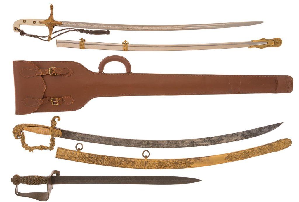 1) N.S. Meyer U.S.M.C. mameluke sword, 35" OAL, 29" etched blade, brass fittings, plastic grips, nickel scabbard. With sword knot, sleeve and leather case. Very good. 2) American "screaming eagle" pommel officer's sword, 37 5/8" OAL, 32" curved etched single fuller blade, gilt hilt with deeply sculpted decoration, carved bone grip and engraved gilt scabbard. Fair with some lost/damaged components. 3) Naval cutlass patterned after (but not) the work of Thomas, Griswold & Company, 26" OAL, 20 3/4" double edged blade, brass guard with cast edge, scaled brass grip. Fair as aged.