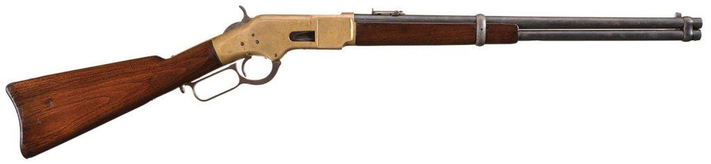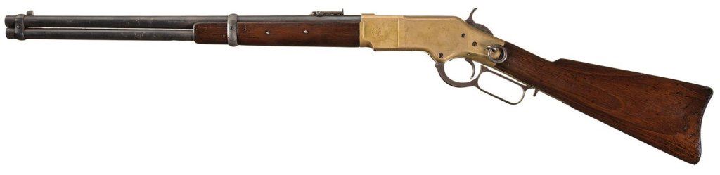 Manufactured in 1879 with a stud/blade front sight behind the magazine retaining band, standard Fourth Model markings, and an "1873" notch and folding ladder rear sight. Despite the disadvantages of the Model 1866s compared to the Model 1873, the "Yellow Boy" remained popular in the American West throughout the late 19th century. They were the first true Winchester firearms and have a well-deserved place in American firearms collecting.