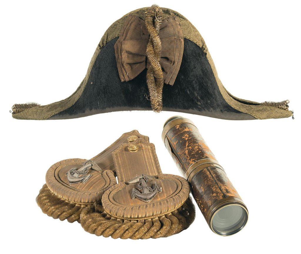 Lot 2234 Naval Bicorn Hat, Epaulettes and Telescope