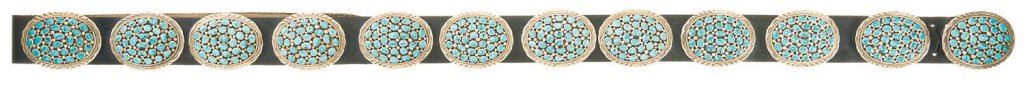 The belt is approximately 57" long and features 12 finely detailed sterling silver conchos with inset blue turquoise stones. Very fine with some natural darker patina on the silver, all of the stones present and tightly fitted, and a few small rub marks on the edges of the black leather belt.