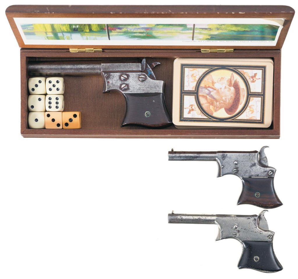 Three Remington Saw Handle Derringer Pistols -A) Remington No. 2 Vest Pocket Pistol with Case, Dice, and Cards