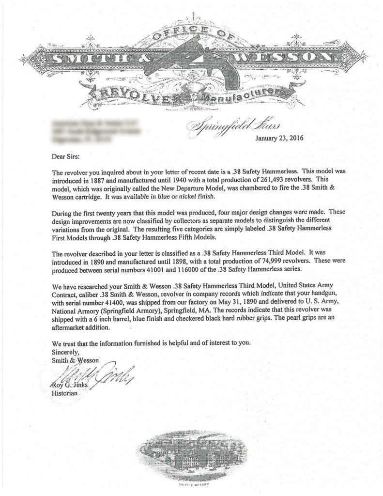 There were only 100 of these 38 Safety Hammerless Revolvers sold to the U.S. Government in May of 1890, making these one of the most difficult and desirable of all U.S. contract arms. The revolvers are Third Models, although they are in the Second Model serial number range, 41333 - 41470 (note serial number of this revolver). The included factory letter states the revolver was shipped from the factory to the Springfield Armory on May 31, 1890, and confirms the barrel length, serial number, and states that it left the factory with hard rubber grips.