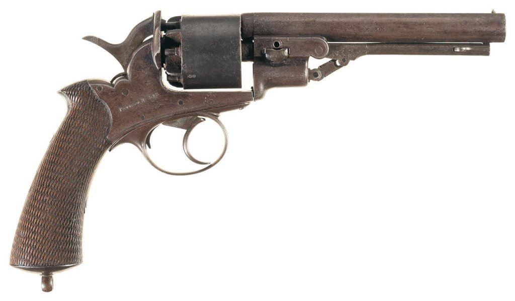 Lot 4086 Cased English Double Action Percussion Revolver with Powder Flask and Cap Tin