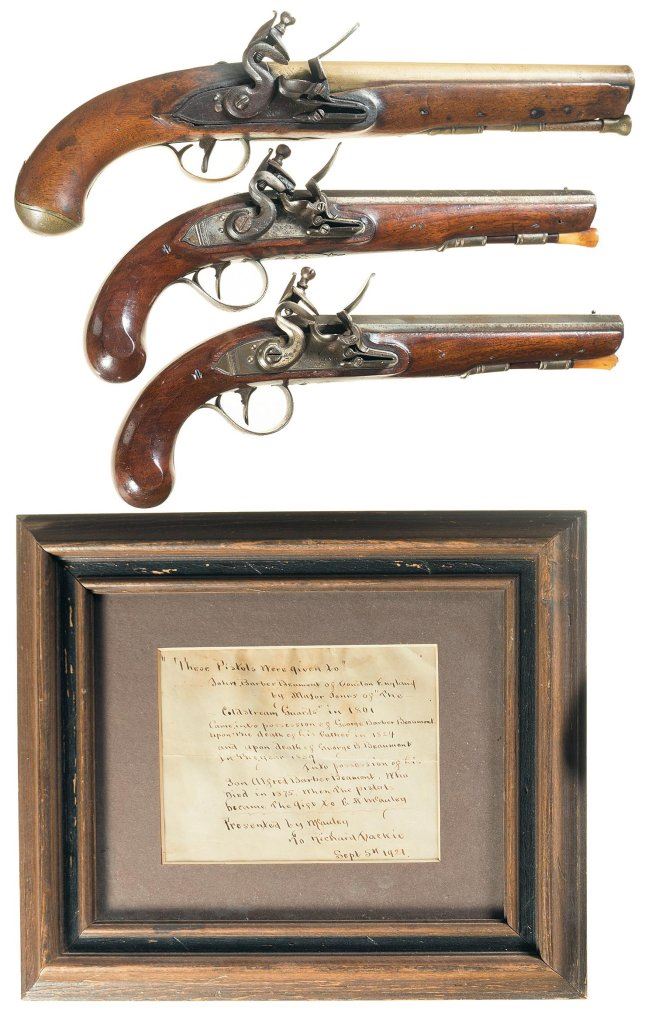 The framed document is dated 1921 and states that the pistols were originally given to John Barber Beaumont of London by Major Jones of the Coldstream Guards in 1801 and then details how they were passed along. Barber Beaumont was a British army officer during the Napoleonic Wars, an accomplished painter specializing in miniatures and historical works, an author, and a philanthropist.
