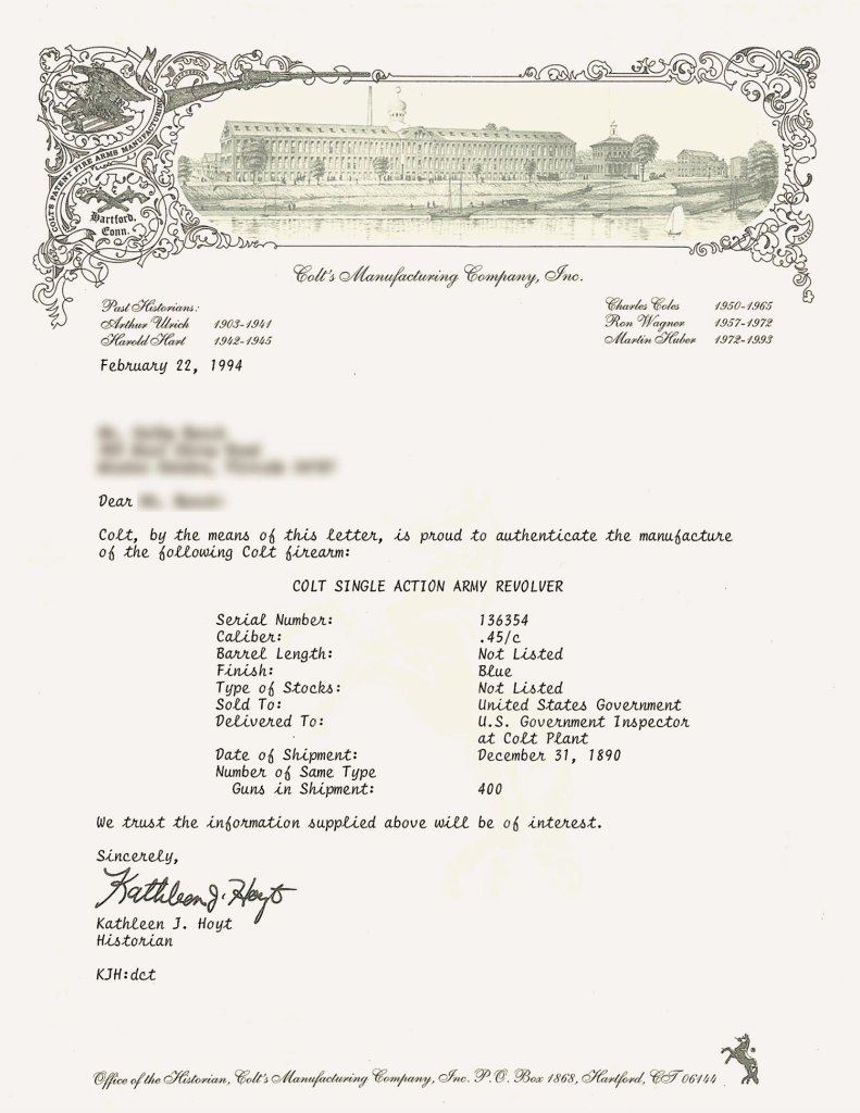 Factory letter confirms caliber and finish with barrel length and type of stocks not listed, shipped to U.S. government on December 31, 1890 as part of a 400 gun shipment. Cartouches on grips with "1890" stamped on left side and "69/3" marked on butt.