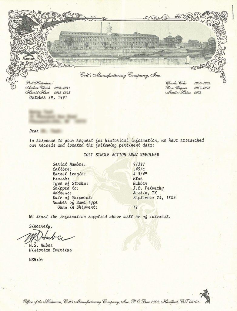 The factory letter indicates it was part of a twelve gun lot shipped to J. C. Petmecky in Austin, Texas, on Sept. 24, 1883, in the current configuration.