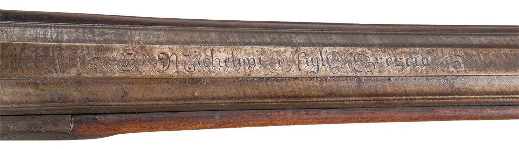 Large fowling piece produced circa 1840. The upper rib of the Damascus pattern barrel is marked "~G. Micheloni y Figli Brescia~". The underside has "BRESCIA/MICHELONI" and "crown/PF" stamps. The inside of the lock has a "A BONET" marking.