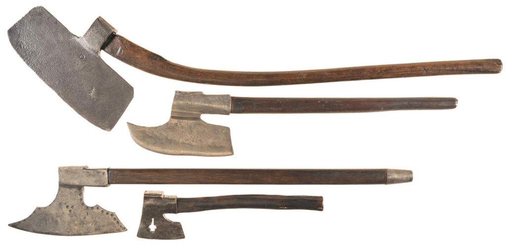 1) Large axe with a control/maker's stamp resembling a tree. 41 1/2" curved wooden haft. Good with extensive moderate pitting. Haft is very loose. 2) Axe with three maker's stamps resembling a smiley face and two etched words (illegible) and a multitude of asterisks stamped around the outside edge of the blade. Mounted on a 34 1/2" wooden haft. Very good with some minor pitting and an artificial patina. 3) Facing axe with 4 control/maker stamps (mostly illegible). Fitted with a 28 1/2" wooden haft. Good as cleaned with scattered minor pitting, some moderate pitting and a 2" crack. 4) Hand axe/hammer with keyhole shaped piercing and control/maker stamps. Appears to be 16th century. 18" long wooden haft. Good with scratches, discoloration, pitting and chipped edges. Haft is loose.