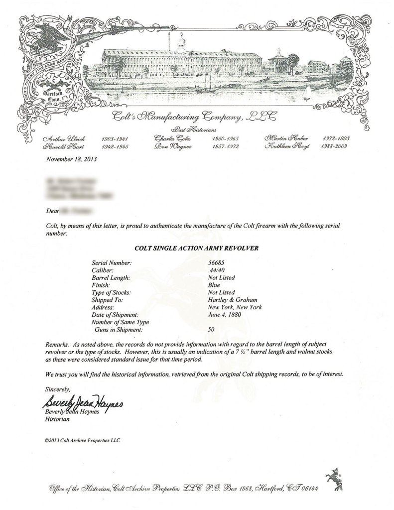 The letter confirms the caliber and blue finish when the revolver was shipped to Hartley & Graham in New York City on June 4, 1880, in a lot of 50 revolvers. The lack of barrel length and grip indicate it was shipped with a 7 1/2 inch barrel and smooth walnut grip.
