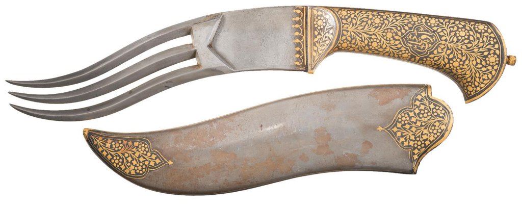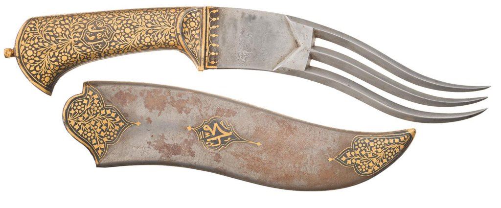 Lot 2364 Unique Gold Koftgari Accented Triple-Point Indo-Persian Knife with Matching Sheath