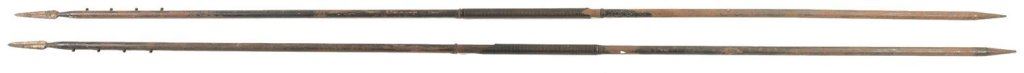 1) The set consists of a full traditional kendogu set including the helmet/shoulder protectors (men), hand and forearm guards (kote), torso protector (do), and the groin protector (tare). A bamboo shinai is also included. Items range from fair to fine. The consignor notes state this was formerly in the Maj. General Frank Osmanski collection. 2) Two German made, Argentine Modelo 1895 cavalry lances with attachment points for pennants. The longer lance measures 10' 6", and the shorter measures 10' 4 3/4". Poor. 3) Hand axe with a single edged crescent shaped blade, 24" wood haft, and a brass end cap. Fair. 4) Two steel or iron spear heads with a black oxide finish, diamond cross section, and pin holes for attaching to a shaft. Fine with some red/orange oxidation on the larger head.