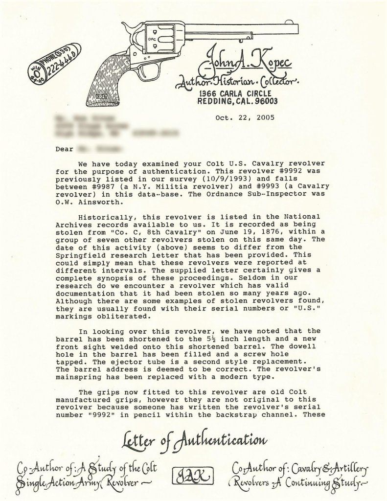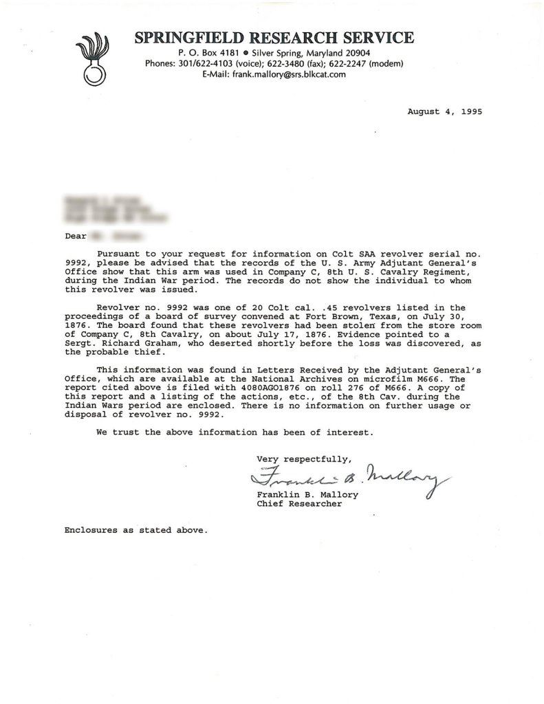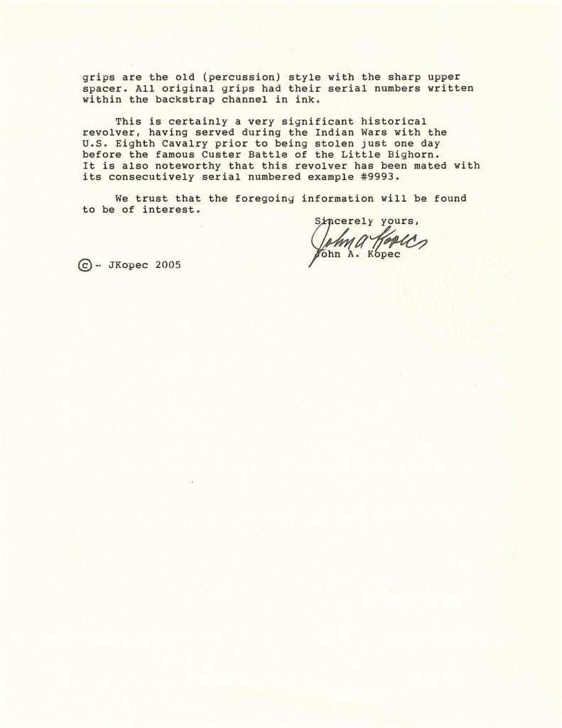 The included John Kopec letter states that this revolver was within a group of seven revolvers stolen from Co. C, 8th Cavalry on June 19, 1876. According to the included Springfield Research Service letter, "evidence pointed to a Sergt. Richard Graham, who deserted shortly before the loss was discovered, as the probable thief." Consecutively numbered with the next lot.