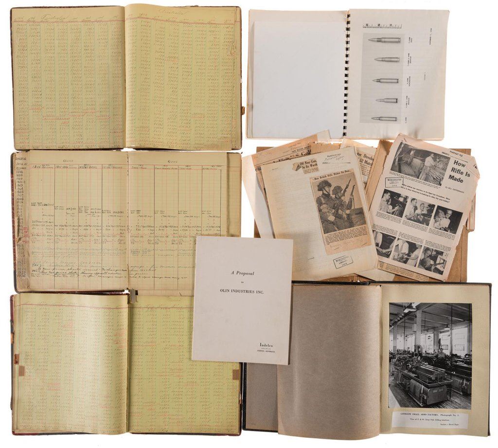 The lot includes 3 Winchester Repeating Arms Co. standard sales record books including foreign and domestic arms sales as well as ammunition sales figures. Books are poor to fair with separated spines and deterioration due to long handling. Sales letter dated Oct. 2, 1911detailing shipments from New York to Brazil. Copy of a business proposal from Indelco of Sydney, Australia, to Olin Industries, that they establish an Australian company named "Winchester Australia Ltd." and make use of the Lithgow small arms manufacturing plant. Finally a proposal from the Winchester Research Group dated 1968 for a Winchester "Minimum Maintenance" 6.35mm infantry rifle complete with research data, technical specs, and pictures.