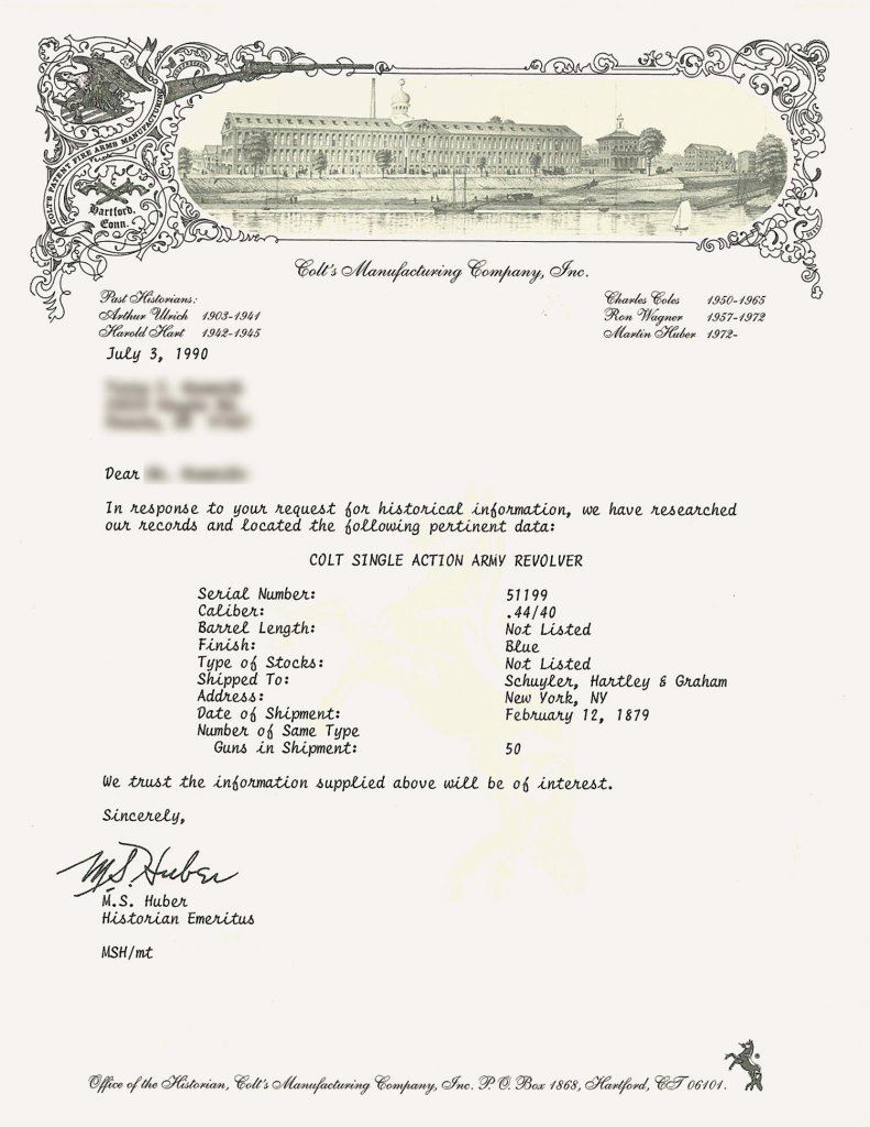 The revolver was one of fifty shipped to Schuyler, Hartley & Graham in New York City on Feb. 12, 1879, in .44-40 with standard finish.