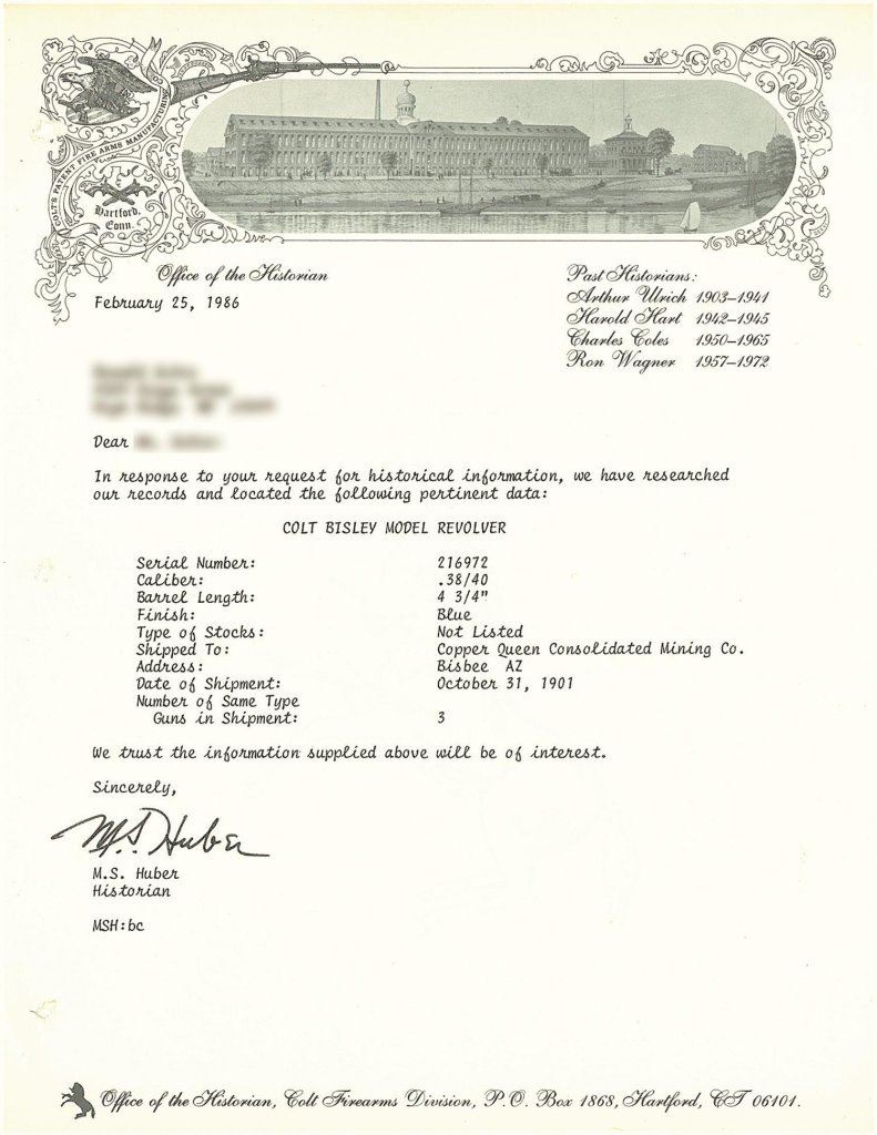 Shipped with three other guns in this configuration (grips not listed) to the Copper Queen Consolidated Mining Co. in Bisbee, Arizona, on October 31, 1901.