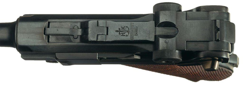 Unusual Krieghoff reworked 1920 commercial Luger. Assembled from left over Simson and Co. Luger inventory transferred to Krieghoff under the Nazis. Blank chamber area with Krieghoff front toggle marked "H/K over Krieghoff/Suhl". Commercial serial number style with frame and barrel numbered (3061) with (61) on the side plate, breechblock and trigger. The barrel, back of the side plate and breechblock have a small "Eagle 6" Simson proof. Commercial "Crown/N" proof on the barrel and barrel extension. Fitted with checkered walnut grips. Complete with a nickel plate magazine with the aluminum base stamped "7,65".