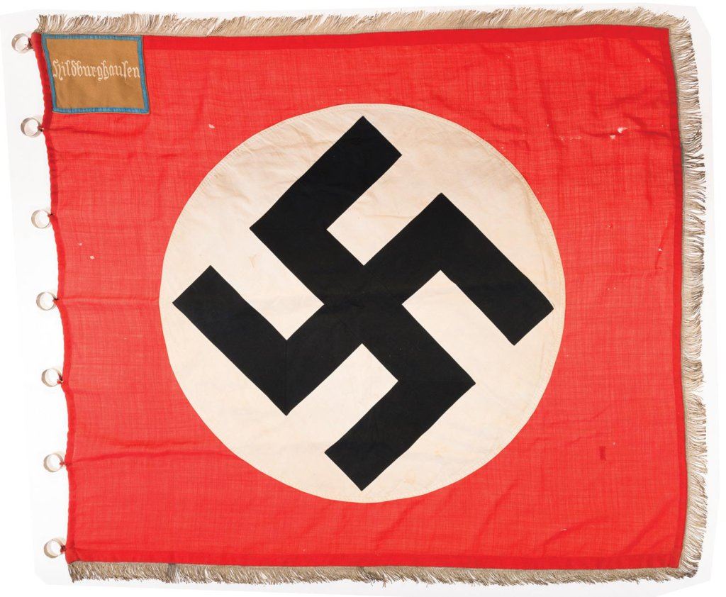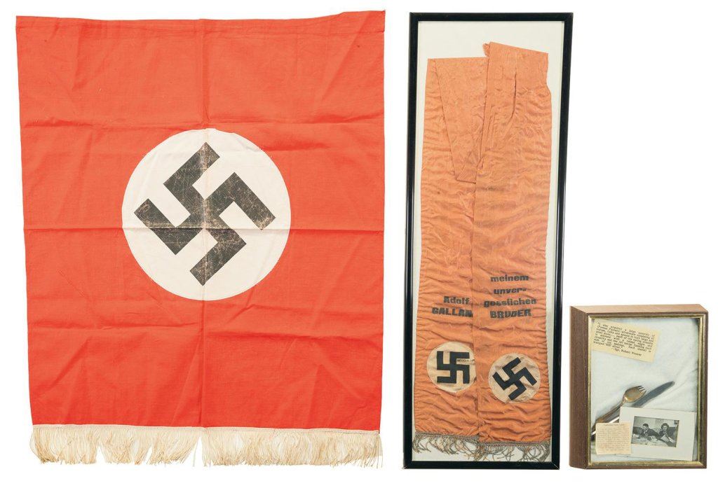 1) Red Flag with Nazi emblems with "hildburghaulen" embroidery, silver fringe, and hanging rings. 2) Nazi podium flag with white fringe. 3) "AH" monogrammed silver terrapin/ice cream fork with swastika and eagle design and a "BH" marked silver table knife in a display case with authentication letter and photograph of Hitler and Eva Braun. The letter and case label state the items were acquired by Sgt. Robert Weaver from the Fuhrer Building and Braunes Haus. The fork (looks like a spork) is an example of the AH Formal tableware pattern known in period as the "Fuhrer Design." 4) Framed fringed silk funerary scarf with swastikas, "Adolf/GALLAND" and "meinem unver-gesslichen/BRUDER" (my unforgettable brother). Galland (1912-1996) was an ace fighter pilot in WWII with 104 credited aerial victories. Condition: Fine overall with moderate fading of the silk and some stains and marks on each item.