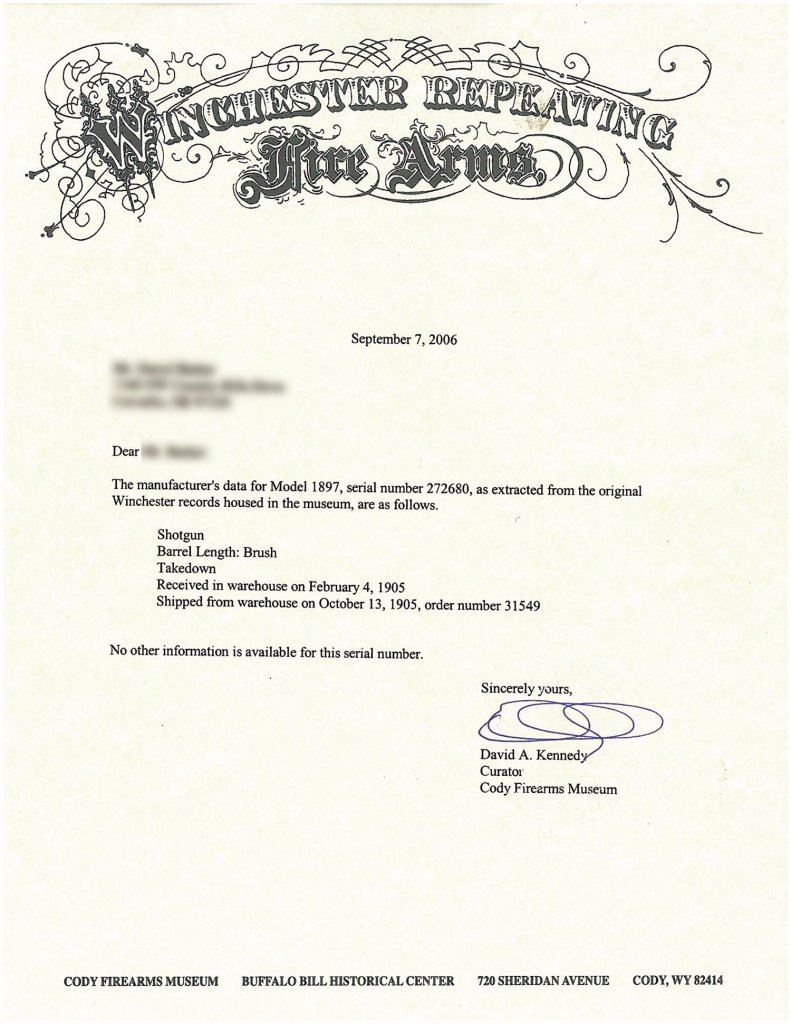 The factory letter confirms the takedown configuration, "brush" length barrel, and that it was received in the warehouse on Feb. 4, 1905, but not shipped until Oct. 13 as part of order 31549. It is choked at cylinder and has a 2 3/4" chamber and 14" LOP.