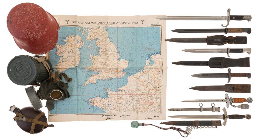 1) Red painted police pattern M1918 German helmet. Fair 2) Gas mask in metal canister with carrying strap marked "VERTRIEB GEMASS 98" Very good. 3) Canteen with strap marked "O.R.G.M/H.R.E.42/ D.R.P.". Very good. 4) German vinyl double sided map with Nazi style markings and marked "LUFT-NAVIGATIONSKARTE IN MERKATORPROJEKTION" and "GERNERALSTAB DER LUFTWAFFE 1940". Very fine. 5) Weyersberg, Kirschbaum & Co. Argentine Model 1909 bayonet. Very good. 6) First pattern Luftwaffe dress dagger with sheath and hanger. Includes a Nazi police style portepee. Fair. 7) Bayonet, scabbard, and frog, scabbard marked "eagle/WaA63", blade marked "dot" and "4935g". The bayonet is fine, sheath is fair and the frog is poor. 8) Second pattern Luftwaffe dress dagger with sheath and portepee. Very good. 9) German Shooting Association dress bayonet with sheath and frog. The grip is marked with a Deutscher Schutzen Verband medallion on the right grip scale. Very good. 10) Remington No. 5 bayonet with sheath and frog. Fine as lightly altered (cross guard).