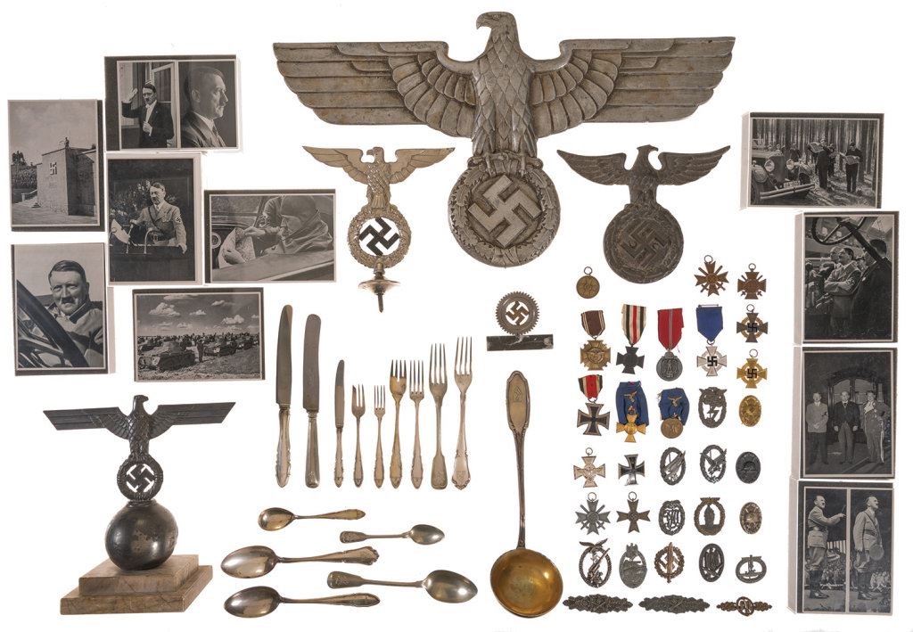 The lot consists of 10 cigarette book style picture, mostly of Hitler. Each picture is numbered with a brief description in German printed on the back. Very fine. Two cast metal Nazi eagle plaques. The larger plaque is cast aluminum, and the smaller is cast iron. Both are fine with aged patinas and some darker oxidation on the cast iron plaque. 14 pieces of silverware. Several of the pieces have Nazi markings at the ends on the grip area, and several bear the personal family crest of Herman Goering of a raised gauntlet grasping a ring on a shield background. 1 large soup ladle with the Goering crest. Silverware is fine to very good with an aged patina on the silver and general handling marks. Assortment of 32 Nazi style medals and badges including the iron cross, wound badges, long service badges, and various other service badges. Fine to very good. Small Nazi gear shaped sculpture with a brown marble base. Very good. Silvered eagle on globe statue with a gray marble base. Fine with an aged dark patina to the silver. Nickel eagle with black enamel swastika. Fine with the base absent.