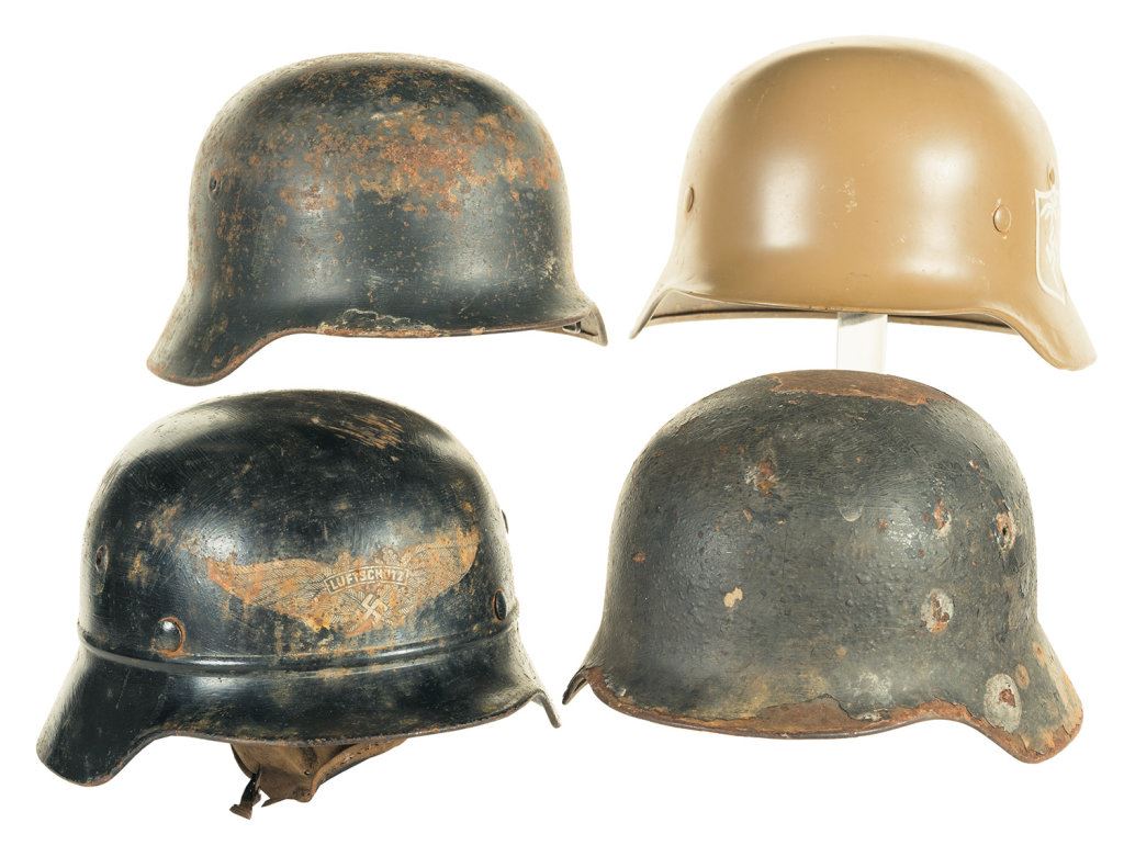 The lot consists of 1 tan painted Stahlhelm with a palm tree and swastika decal on the left side and a partial "black/white/red" shield decal on the right. Fine as painted with added decals. Black Stahlhelm with a Kriegsmarine style black and gold eagle/swastika decal on the left side. Poor, showing heavy oxidation, scuffs, chips and deterioration of the liner. M1935 Luftschutz helmet. Fair with a black painted exterior, significant deterioration of the liner, and patchy oxidation throughout. Black painted Stahlhelm with a police decal on the left side. Poor with large areas of chipped paint, faint decal, and rough oxidation throughout.