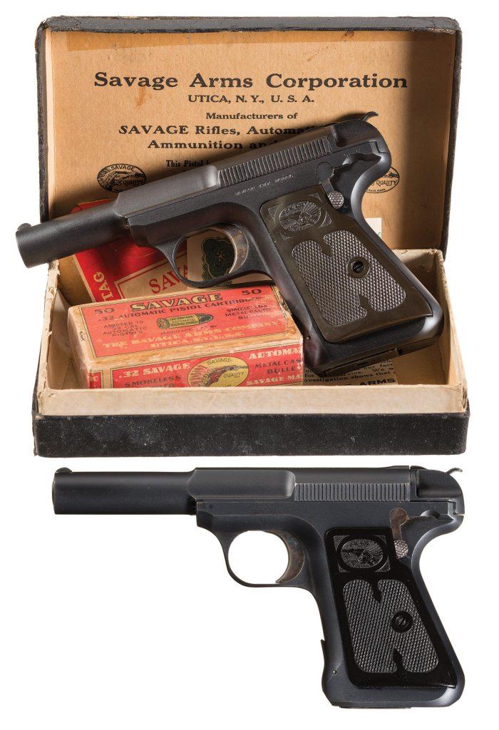 The box is numbered to the gun and includes a 50 round box of Savage .32 ACP ammunition and papers.