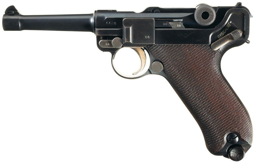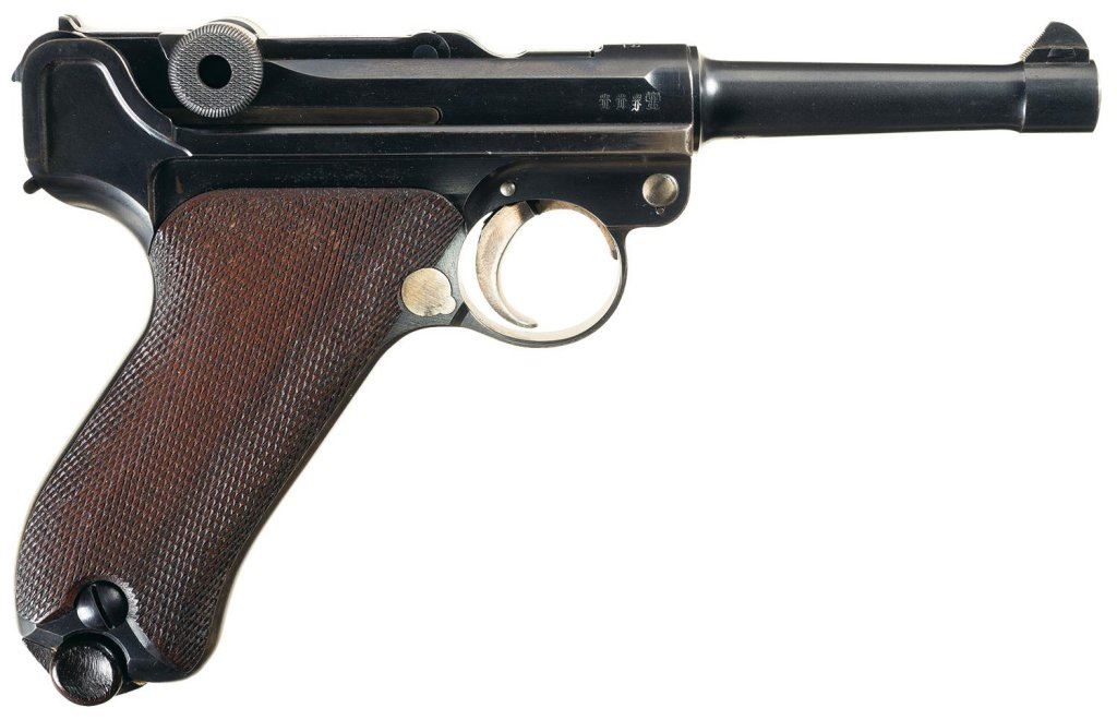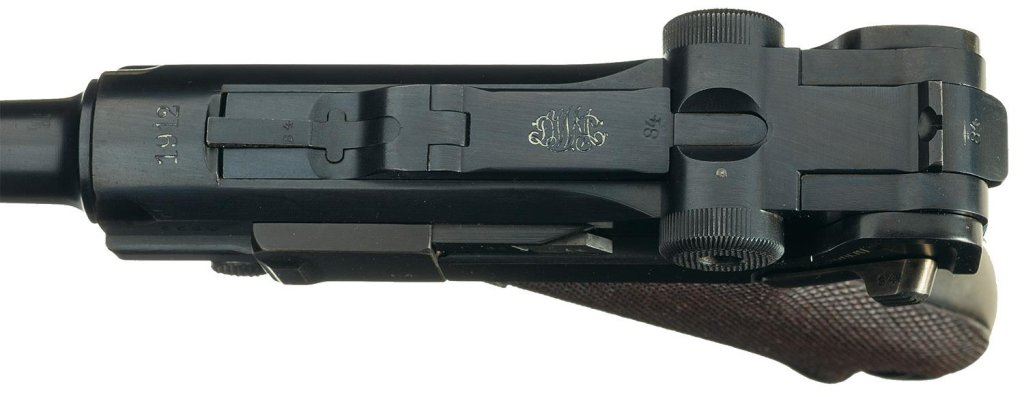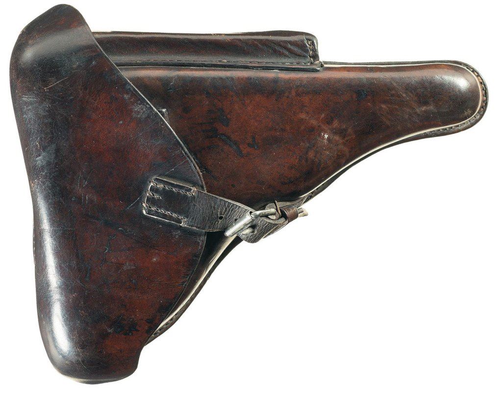 This is a very desirable example of a early 1912 dated DWM Model 1908 military Luger rig with a desirable 1912 dated brown military holster. This is an early 1912 Luger with no letter code on the serial number and standard markings and proofs. The fine brown leather holster is marked on the back with "M. ZOTZ/SATTLER/LANDAU/PFALZ" in an oval with "12/AWM/16/12" stamped on the upper front. The magazines have unmarked walnut bases, and the takedown tool is also unmarked.