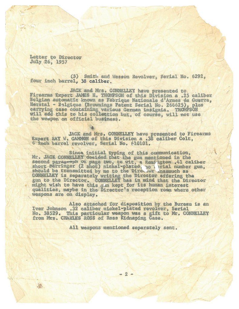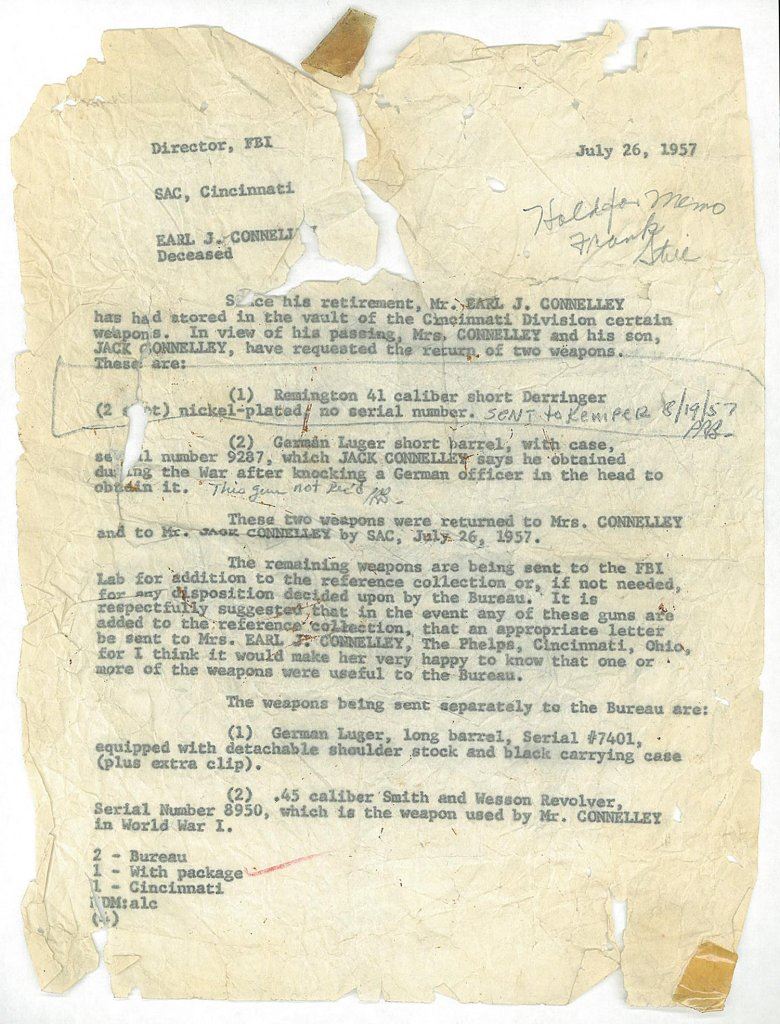 The pistol includes an F.B.I. memo that lists this piece by serial number as property of Earl J. Connelley, Assistant Director and S.A.C. (Special Agent in Charge) at the Cincinnati, OH branch office of the F.B.I.