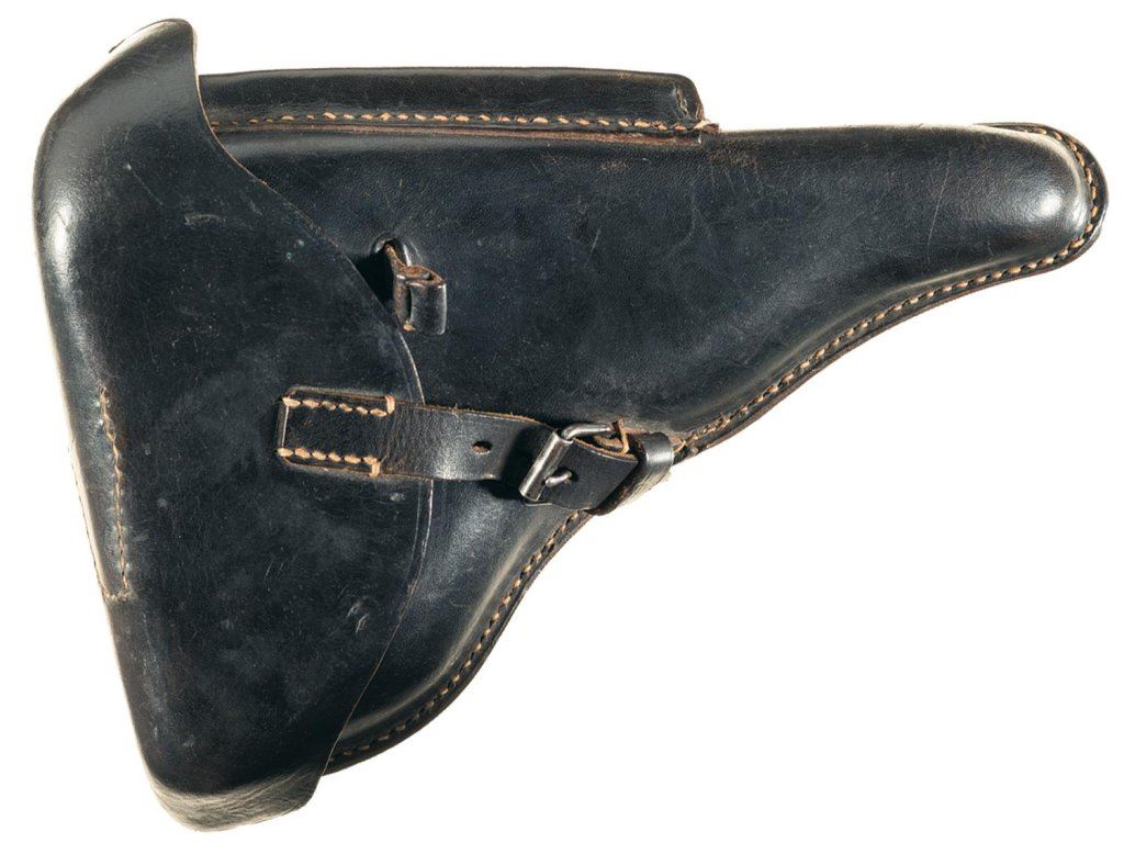 The chamber is dated "1917". Includes a black leather holster marked "ALBIN SCHOLLE/1939/ZEITZ" over the "eagle/WaA1170" acceptance mark. The holster includes an extra magazine and tool.